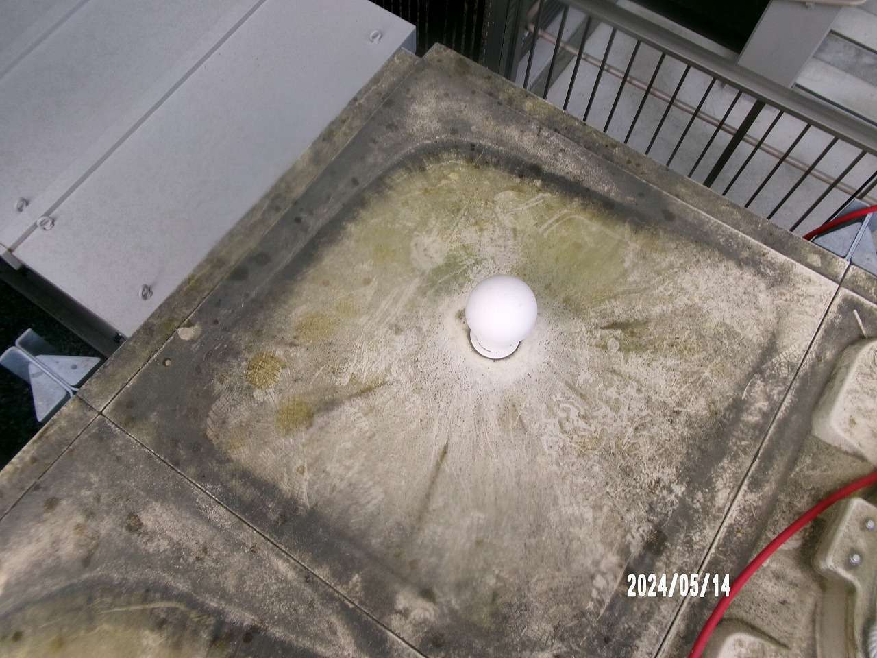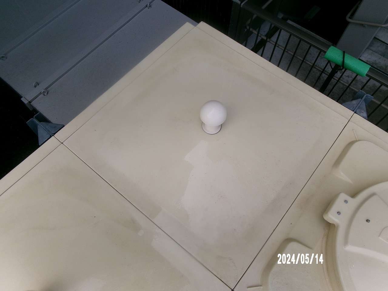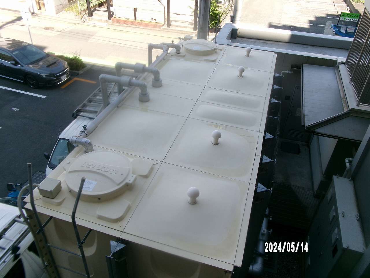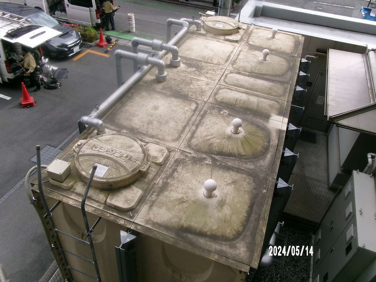 貯水タンクの外面全体に、長年の埃やコケ、排気ガスなどによる黒ずみや汚れが堆積し、美観が著しく損なわれている状態でした。特に天面には雨水による汚れが集中し、白い素材がほとんど見えないほどでした。
