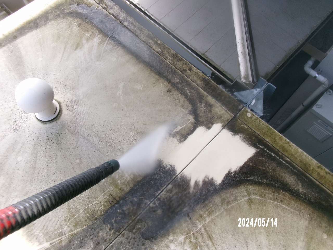 ・【高圧洗浄機による洗浄】:専用ノズルを使用し、高圧水流で効率よく全体を洗浄。素材を傷めずに汚れだけを除去できるよう、適切な圧力設定と洗浄方法を選定しました。