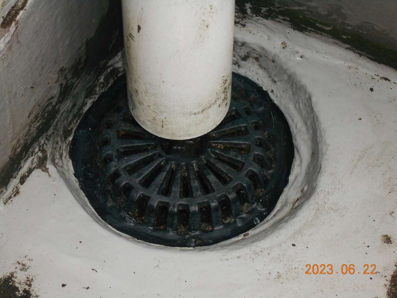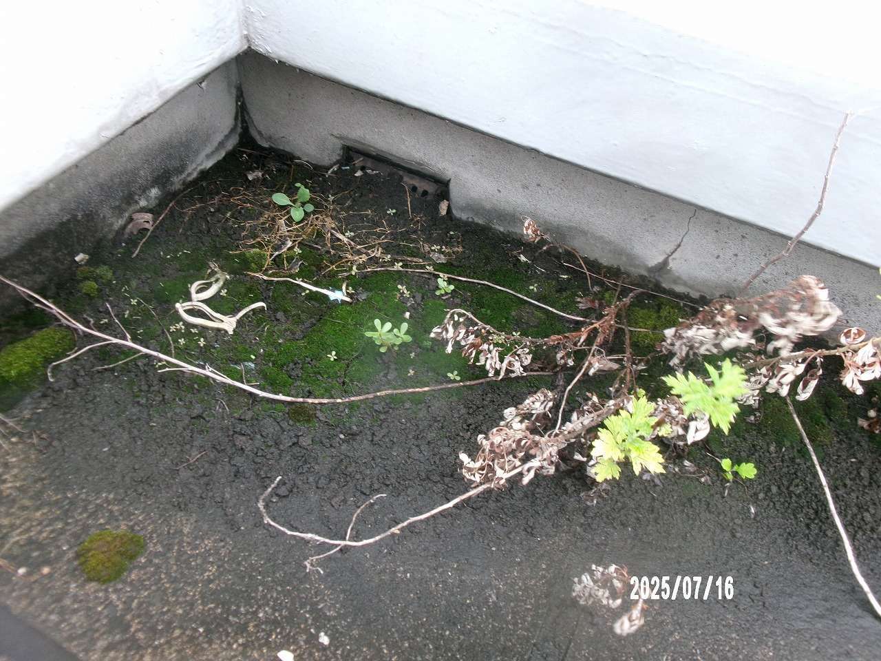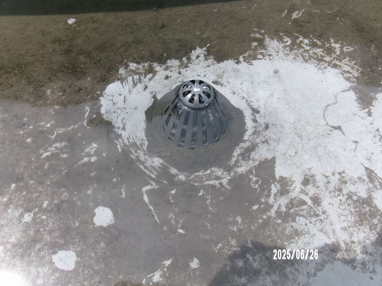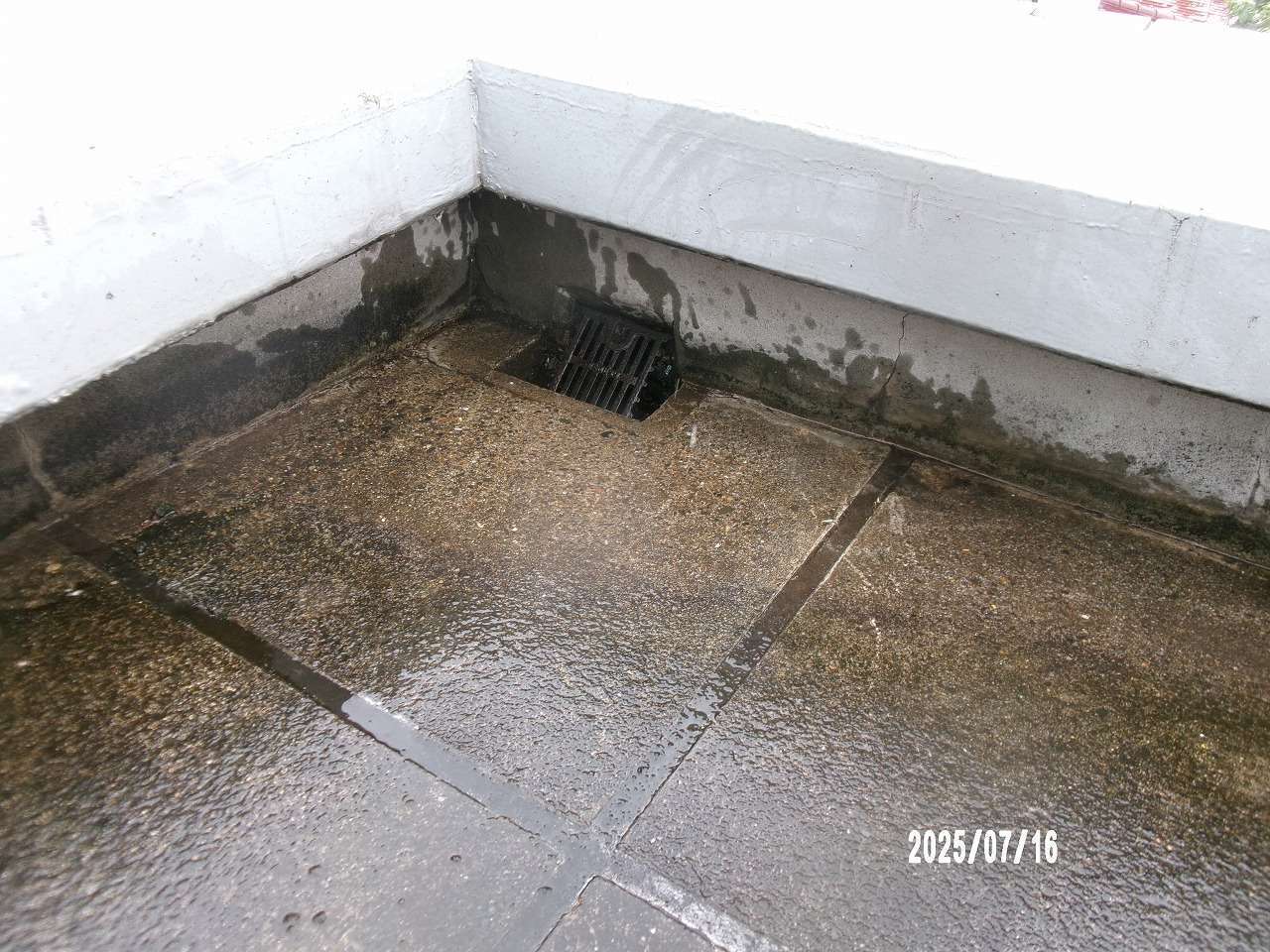コケや雑草を手作業で除去した後、周囲を高圧洗浄。詰まりの見られた排水口には専用ロッドを使用し、配管内部まで異物を除去。詰まり解消後、防水コーティングの再塗布を行い、耐久性を向上させました。
