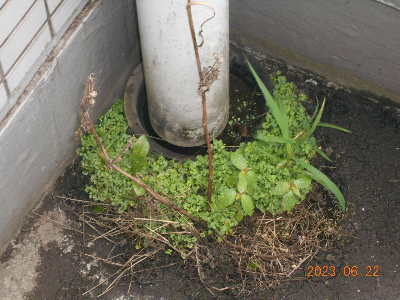 屋上に設置された複数の排水口周辺および受水槽の天板には、長年の風雨や排気ガスなどの影響により、コケ・藻類・泥・排気汚れなどが蓄積していました。特に排水口付近は落ち葉や雑草などの堆積により排水機能が著しく低下しており、雨水の流れを阻害する恐れがある状態でした。
